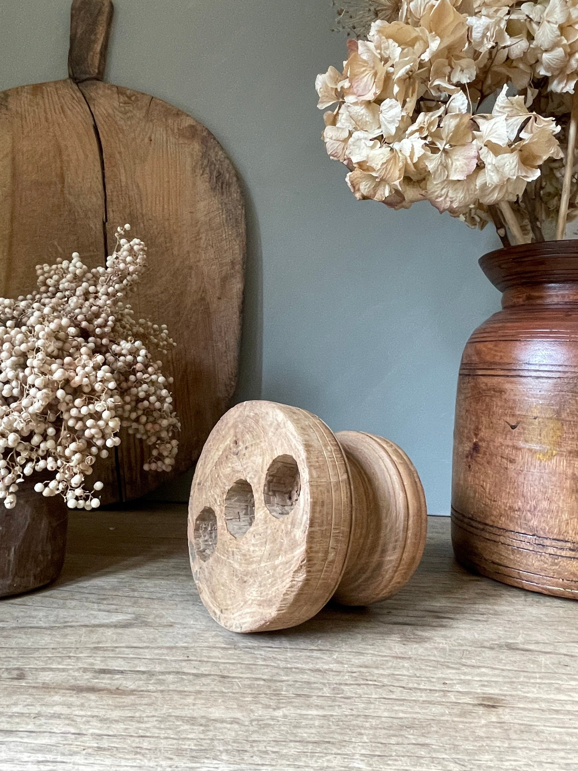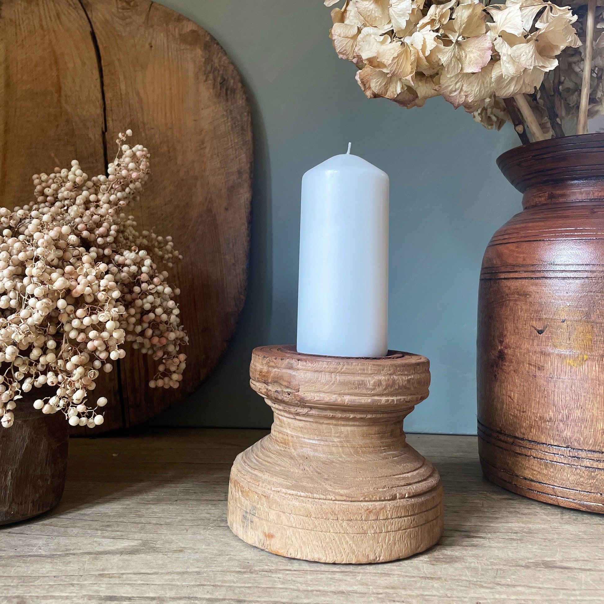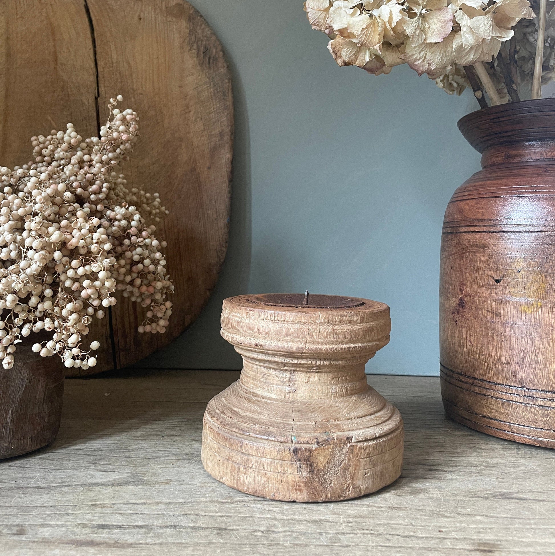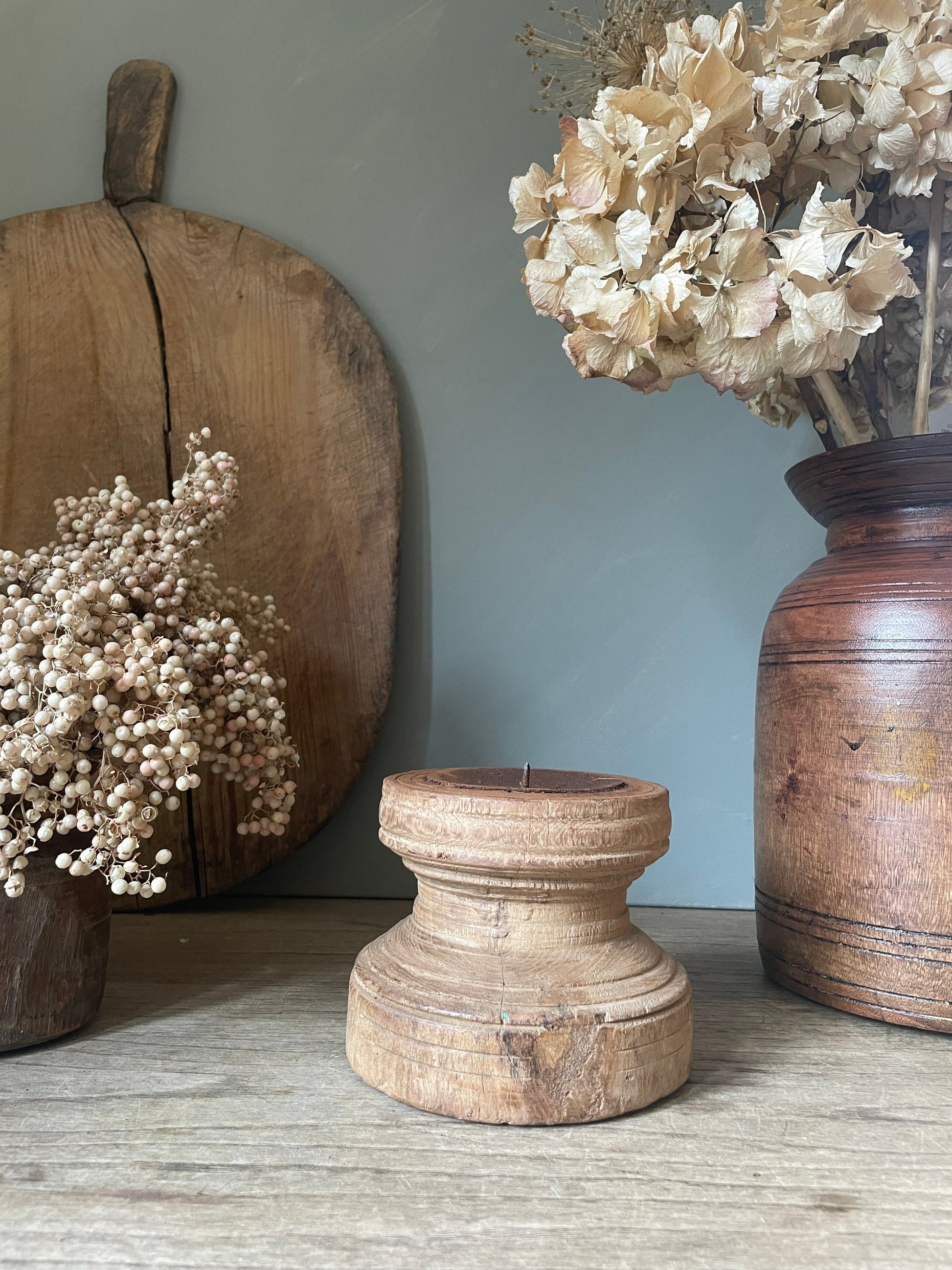 They originally come from temple pillars in Nepal, repurposed into these beautiful statement holders with a metal spike and dish at the top.
